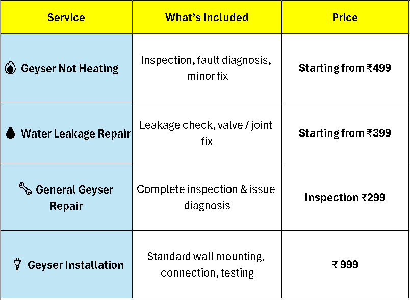My geyser suddenly stopped heating early in the morning. I called them and the technician arrived within 45 minutes. He checked the heating rod, explained the issue clearly, and fixed it the same day. Very professional service and reasonable charges.